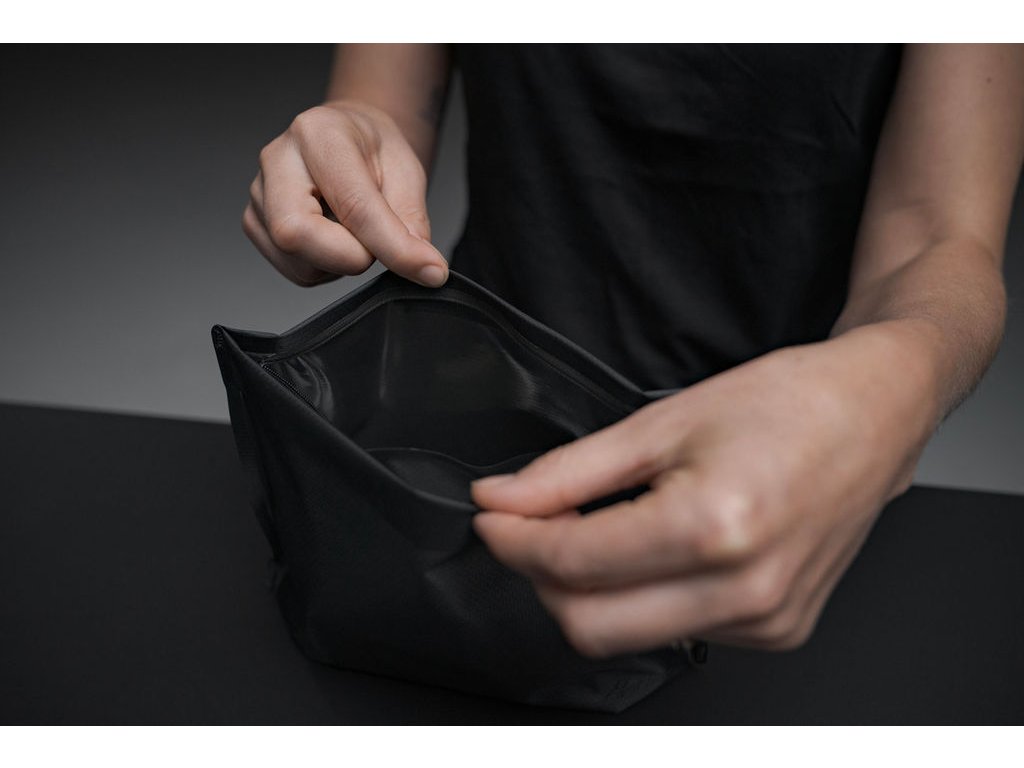 Maximálna kapacita 2,25 l sa hodí na zubné kefky a cestovné potreby a pri naplnení sa dokáže roztiahnuť. Súčasťou dizajnu je ploché dno, vďaka ktorému puzdro neprepadáva a uľahčuje prístup k veciam. Do puzdra je zároveň dobre vidieť. Váži iba 33 gramov.