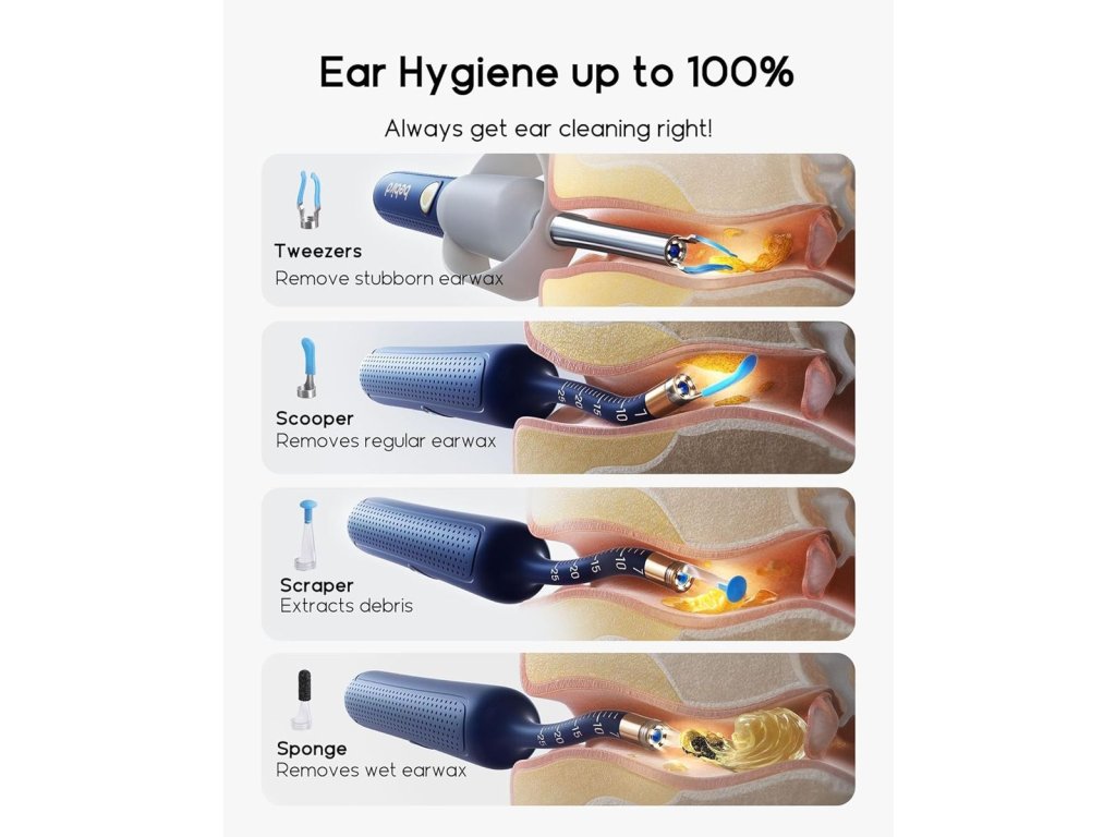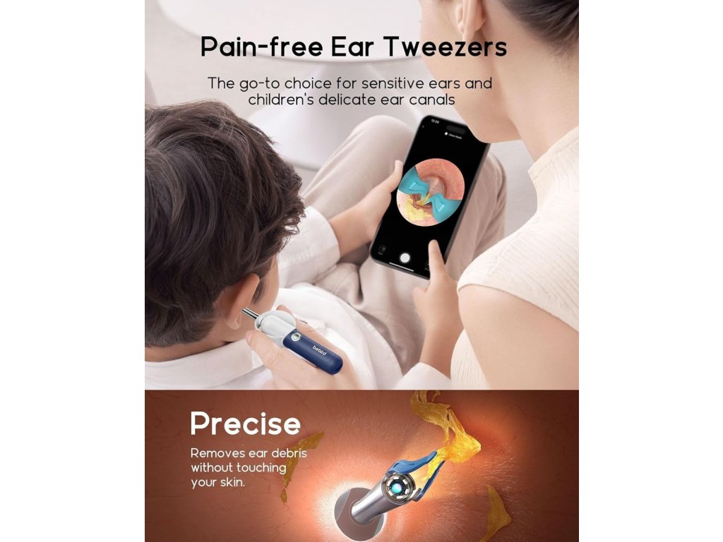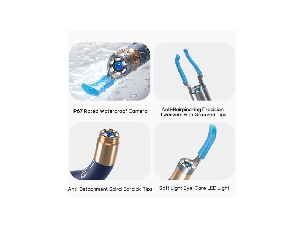 Súčasťou sady Bebird sú aj viditeľné pinzety s kamerou, ktoré umožňujú veľmi jemné a presné odstránenie ušného mazu bez nutnosti dotýkať sa stien zvukovodu. Tento nástroj je ideálny na citlivé alebo menšie uši – napríklad u detí – a zabezpečuje úplne bezbolestné, ale účinné čistenie. Vizuálna kontrola počas procesu navyše výrazne znižuje riziko poranenia a zvyšuje presnosť.