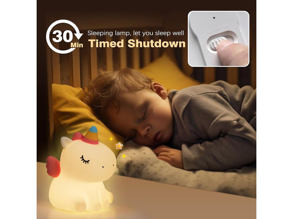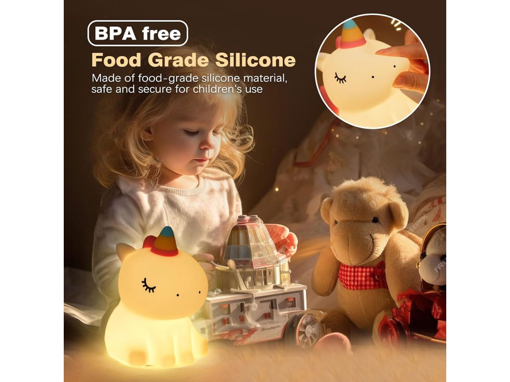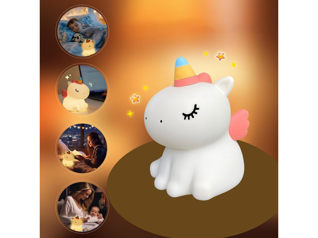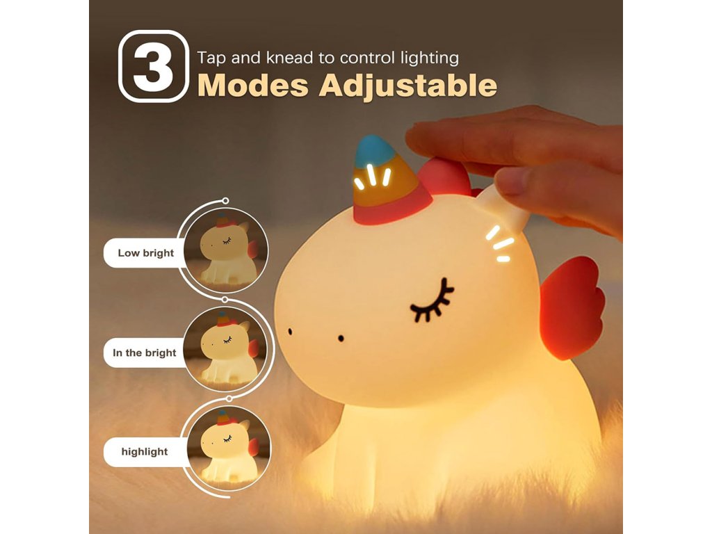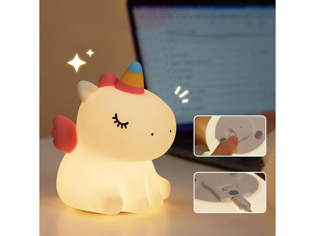 Tento roztomilý silikónový nočný svetielko v tvare jednorožca je ideálny doplnok do detskej izby alebo spálne. Poskytuje príjemné žlté svetlo v 3 intenzitách, ktoré pomáha vytvoriť príjemnú atmosféru vhodnú na odpočinok alebo zaspávanie. Nočné svetlo je vyrobené z nezávadného potravinárskeho silikónu a ABS materiálu bez BPA, čo ho robí bezpečným aj pre najmenšie deti. Jeho roztomilý dizajn z neho robí perfektného spoločníka do detskej izby aj originálnu dekoráciu.