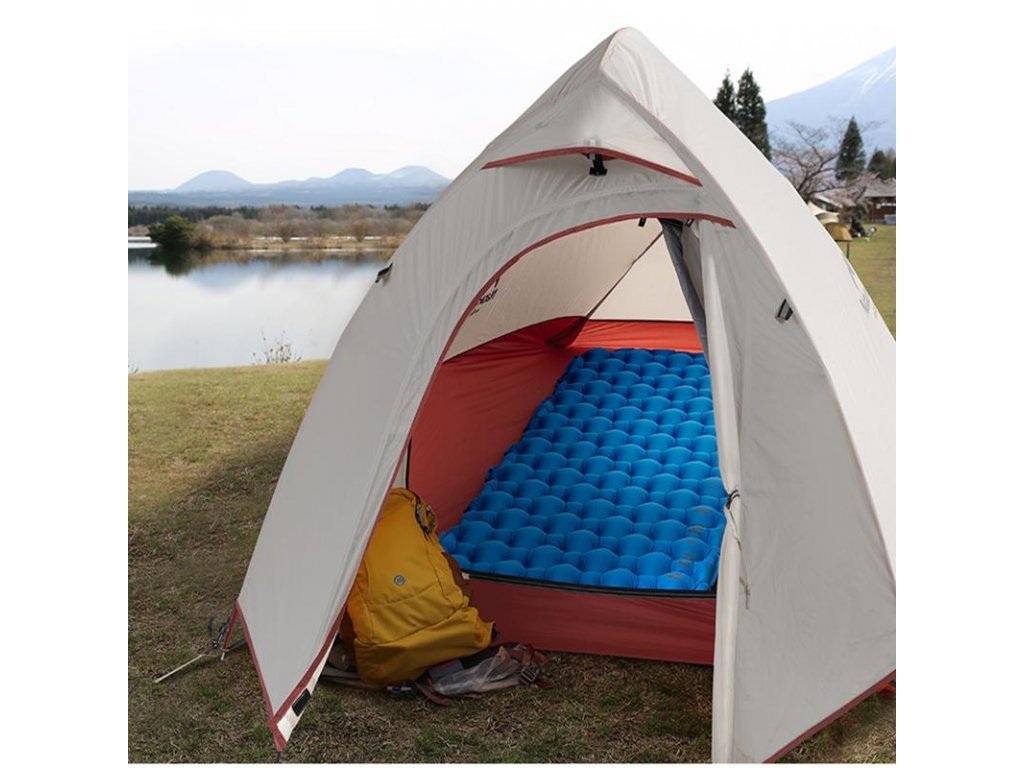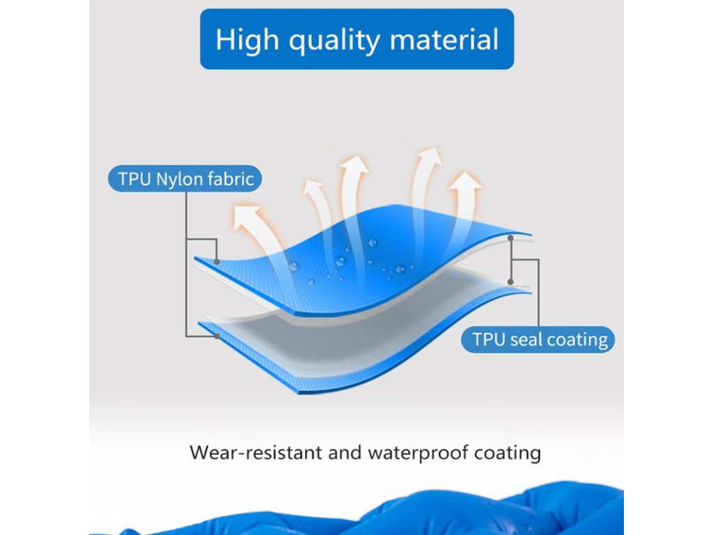 Kosoštvorcový dizajn poskytuje dobrú podporu a jednoduchú cirkuláciu vzduchu. Karimatka je vyrobená z odolného Nylonu TPU, ktorý je odolný voči opotrebovaniu a je vodotesný.