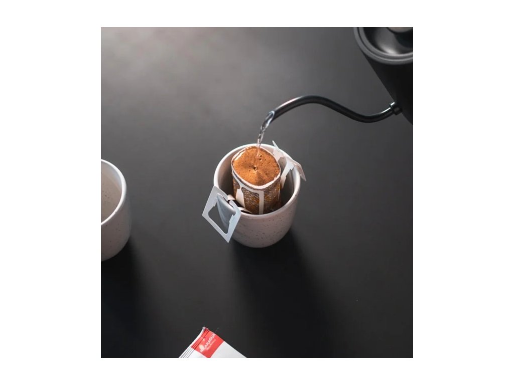 Každý filter obsahuje 100% výberovú Arabiku, namletú priamo do praktického filtra, aby bola vždy čerstvá a aromatická. Príprava je blesková: stačí odtrhnúť hornú časť filtra pozdĺž nápisu „Open“, nasadiť filter na šálku, postupne zaliať 175 ml horúcej vody a nechať kávu prekvapkať. Tento spôsob prípravy, pôvodom z Japonska, sa zrodil v 90. rokoch ako mobilná verzia klasického dripperu. Vďaka skladnosti, jednoduchosti a prekvapivo kvalitnej chuti sa stal obľúbeným spoločníkom doma, v práci aj na cestovanie.