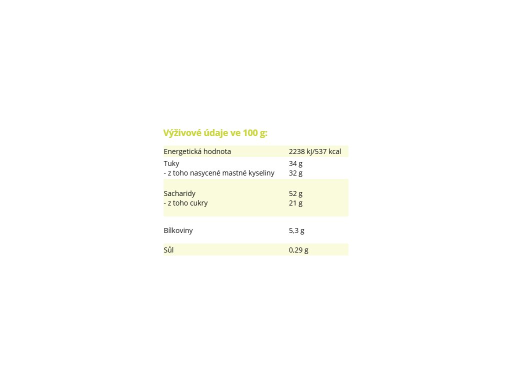 | Zloženie: | Kokosové mlieko* 66 % (kokosová dužina*, maltodextrín*), kokosový cukor*, kurkuma* mletá 5,36 %, škorica* mletá, zázvor* mletý, kardamóm* mleté, čierne korenie* mleté. *z ekologického poľnohospodárstva. |