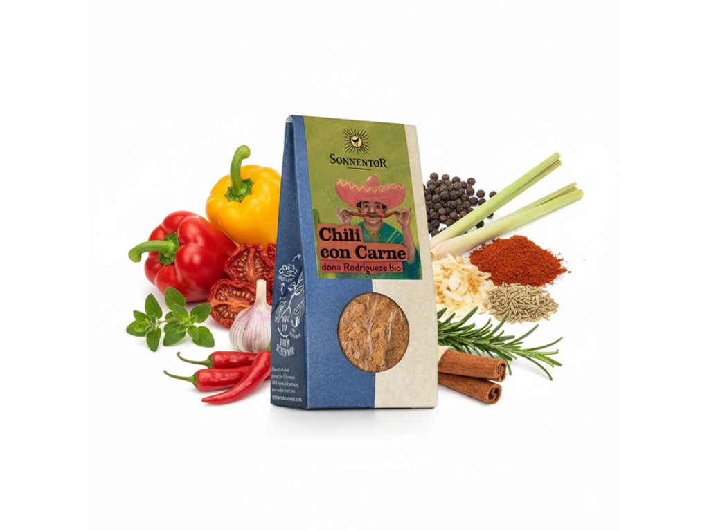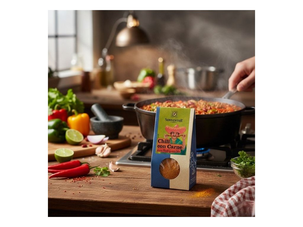 Preneste sa do sveta slnka, farieb a odvážnych chutí s bio koreninovou zmesou Chili con Carne dona Rodrigueza od Sonnentoru. Táto zmes je inšpirovaná tradičnou mexickou kuchyňou, ktorá je preslávená svojou výraznosťou a temperamentom. Vďaka kombinácii papriky, rasce a ďalších aromatických ingrediencií vytvoríte v priebehu chvíľky jedlo plné života, vône a pikantnej energie. Jasne červeno-oranžová farba zmesi a jej príjemná papriková aróma navodia atmosféru pravej latinskej kuchyne – aj keď zostanete vo svojej domácej kuchyni.