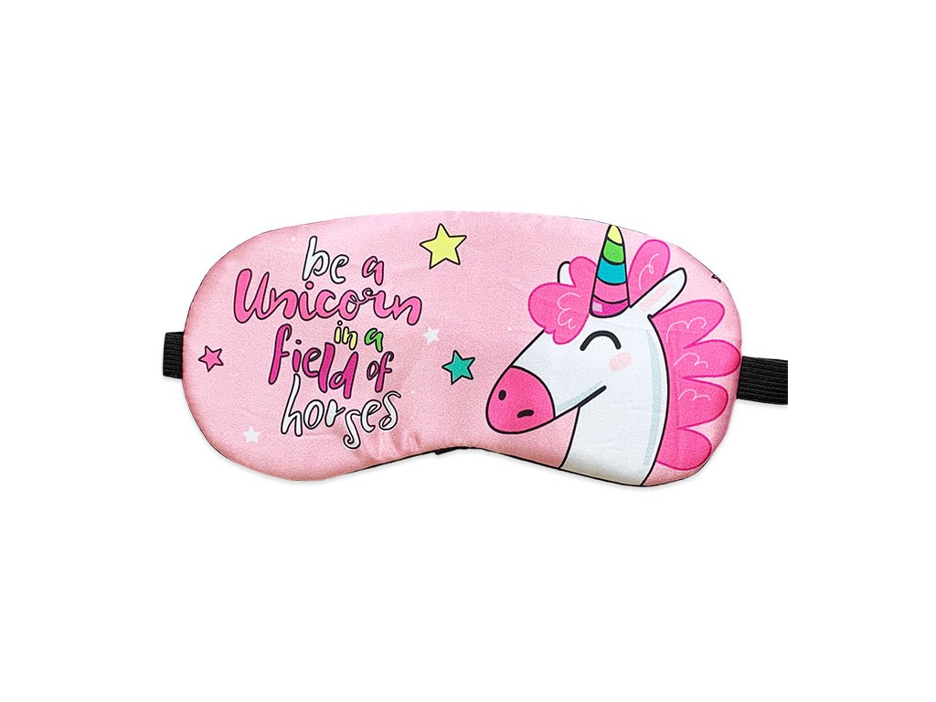 Ružová maska na oči na spanie s nápisom „Be a unicorn in a field of horses“ v preklade „Buď jednorožcom na poli plnom koní“. Maska je pohodlná, príjemná na tvár a chráni oči pred svetlom. Maska má zároveň zábavnú funkciu pre deti.