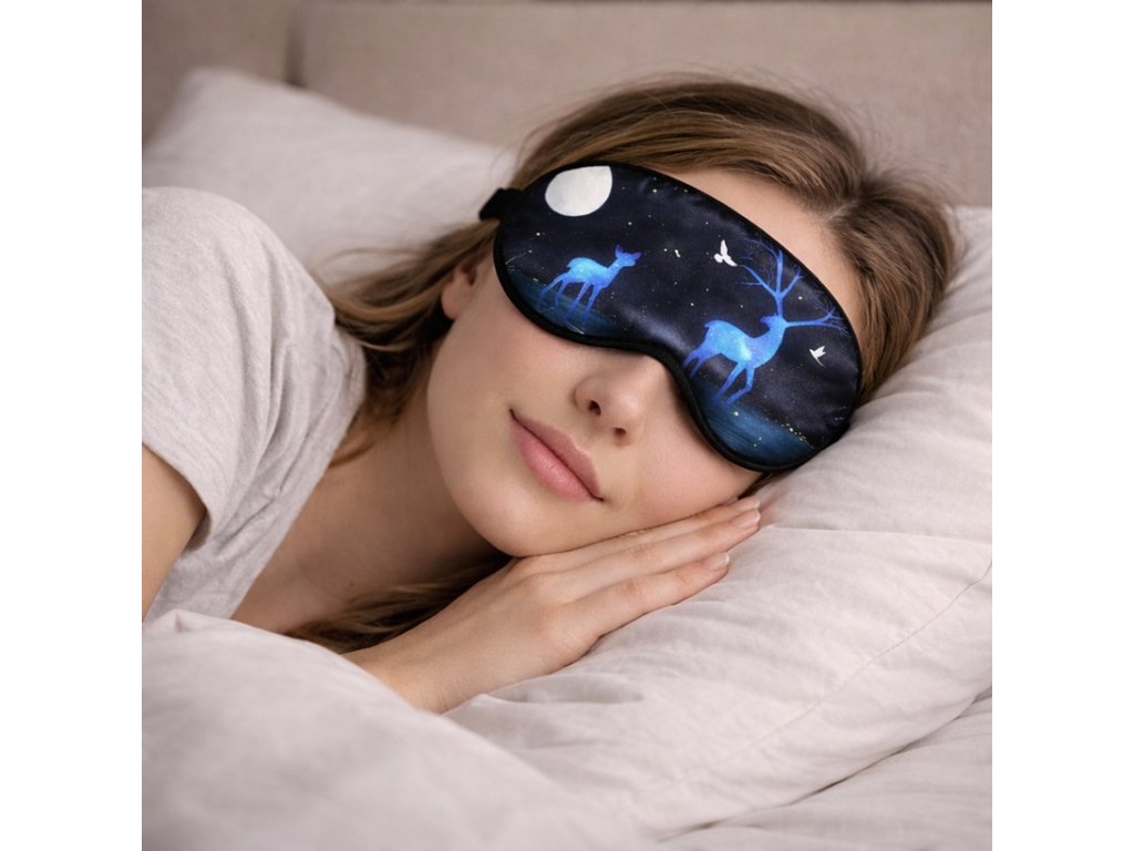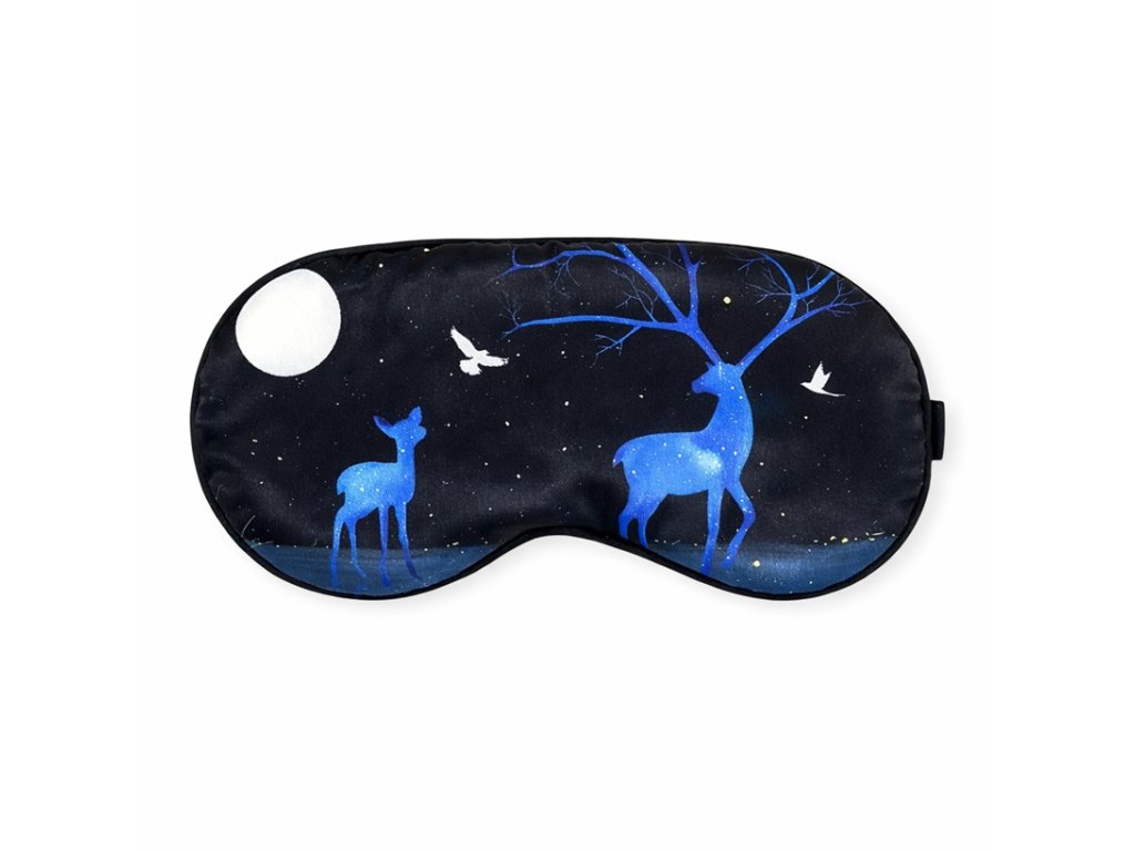 Maska na oči na spanie s motívom jeleňov v noci. Pohodlná, príjemná na tvári a chráni oči pred svetlom. Maska má ľahkú výplň, ktorá zabezpečuje, že lepšie sedí na tvári. Zároveň môže trochu viac hriať.