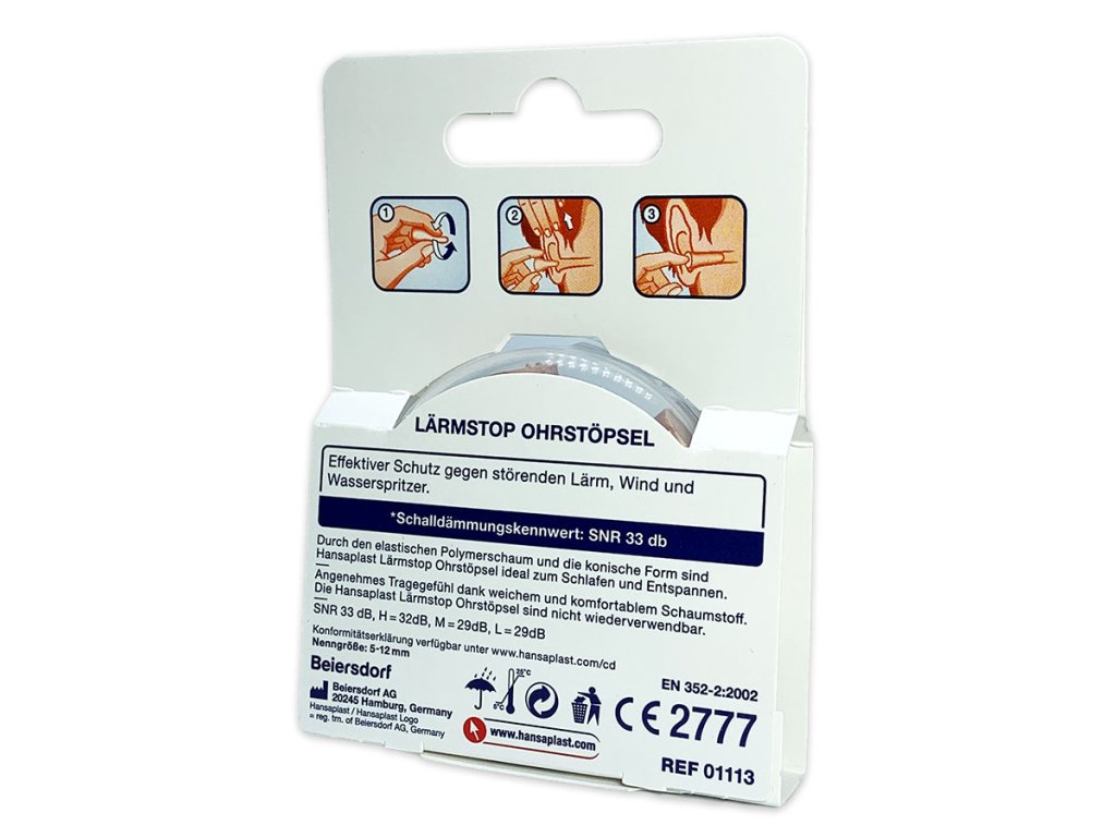 Hansaplast špunty do uší poskytujú efektívnu ochranu proti hluku. Špunty sú ideálne na spanie a relaxáciu. Sú mäkké a pohodlné. Dosahujú hodnoty utlmenie SNR 33dB.