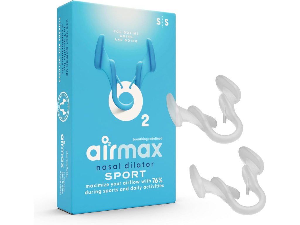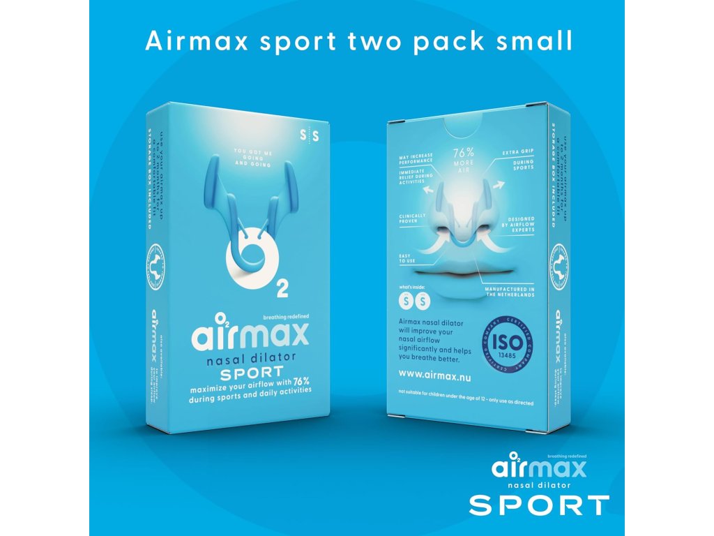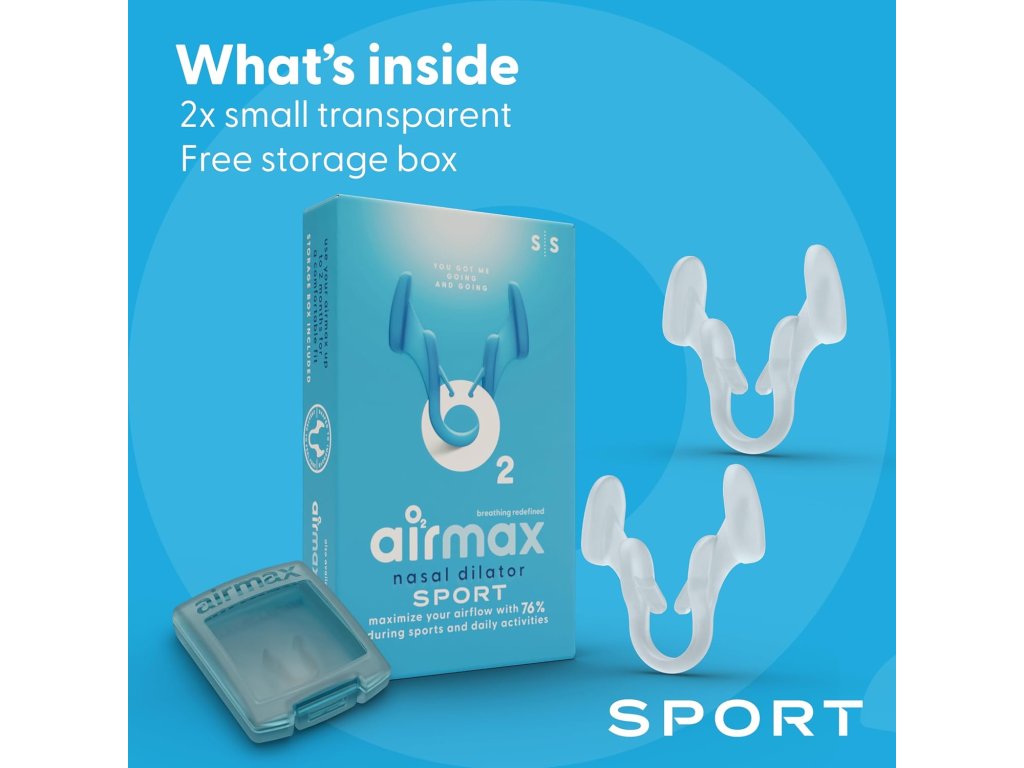 Airmax Sport je špeciálny nosový dilatátor, ktorý jemne rozširuje užšiu časť nosových priechodov. Vďaka tomu dochádza k výraznému zlepšeniu prúdenia vzduchu nosom a uľahčuje sa aj samotné dýchanie. Podľa nezávislých štúdií môže Airmax zvýšiť priepustnosť vzduchu až o 76 %, čo znamená, že sa do pľúc dostane viac kyslíka. To prináša významné výhody nielen pre športovcov, ale aj pre bežných používateľov, ktorí chcú pri pohybe lepšie dýchať. Oproti klasickej verzii Airmax Classic má dilatátor Sport špeciálne úchytky, ktoré bránia vypadnutiu dilatátora z nosa aj počas aktivity.