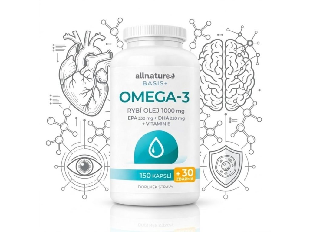 Allnature Basis + Omega 3 je doplnok výživy s rybím olejom bohatým na omega 3 mastné kyseliny EPA a DHA, doplnený o vitamín E. Je určený na každodenné užívanie a pomáha jednoducho doplniť omega 3 v strave, aj keď ryby nejete pravidelne. EPA a DHA prispievajú k normálnej činnosti srdca a DHA podporuje normálnu činnosť mozgu aj udržanie normálneho zraku.