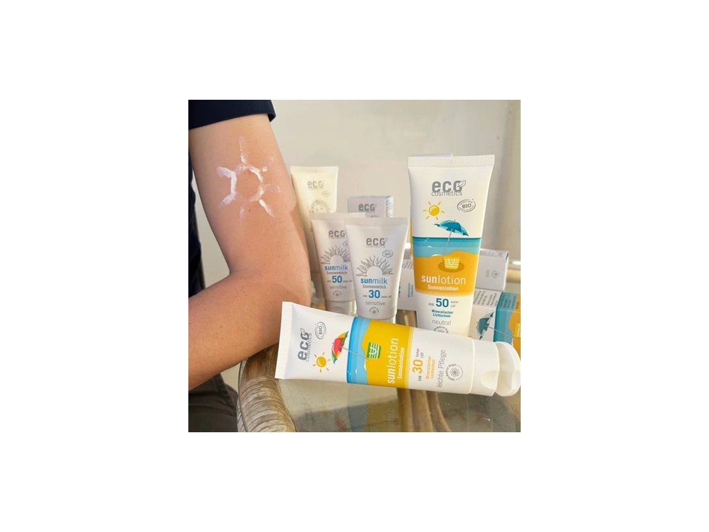 Eco Cosmetics používa minerálne UV filtre na báze oxidu titaničitého a oxidu zinočnatého, ktoré na pokožke fungujú ako ochranný štít – slnečné lúče odrážajú, namiesto toho, aby ich pokožka absorbovala. Tento fyzikálny princíp je bezpečný, nespôsobuje alergie a je odporúčaný aj pre najcitlivejšie typy pleti. Navyše sú tieto filtre schválené americkou agentúrou FDA ako účinné a bezpečné.