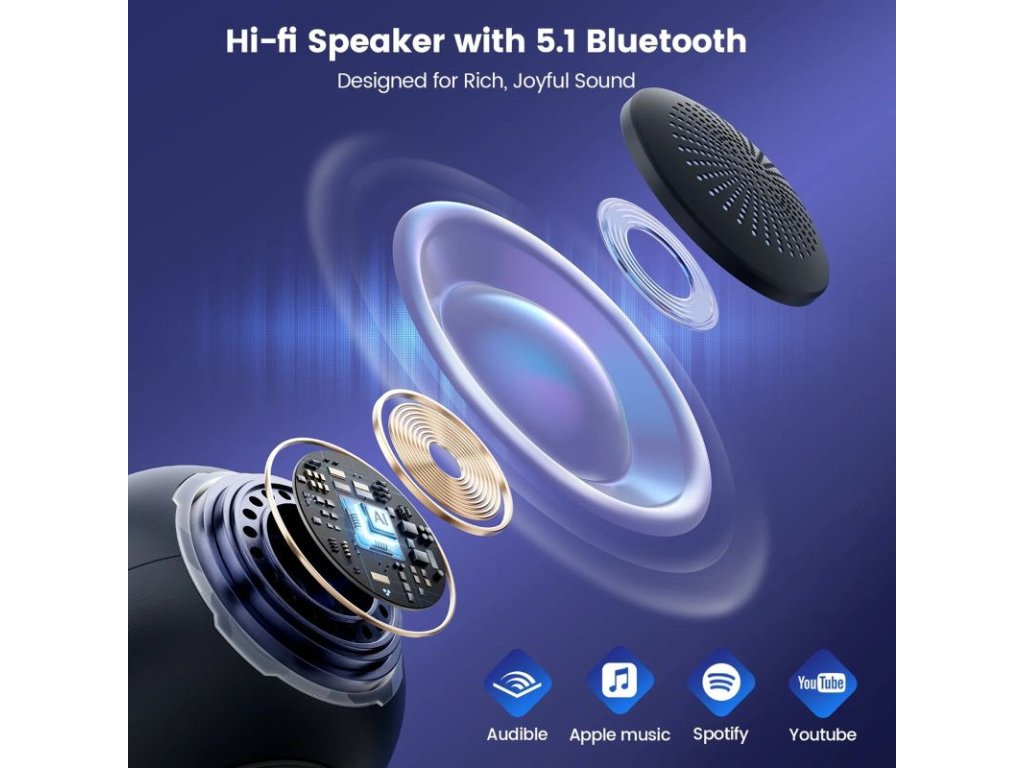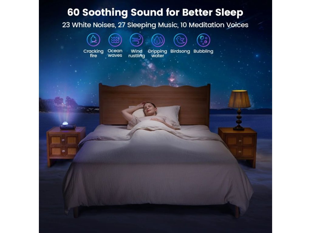 Glocusent Sleeping Pod nie je len o vizuálnom zážitku – obsahuje aj výkonný prehrávač bieleho šumu s viac ako 60 zvukovými stopami navrhnutými pre kvalitný spánok. Nájdeš tu 23 bielych šumov, 27 melódií a 10 meditačných nahrávok. Kombinácia hviezdnej projekcie a jemných zvukových podnetov vytvára dokonalé zmyslové prostredie podporujúce zdravé zaspávanie aj nerušený spánok.