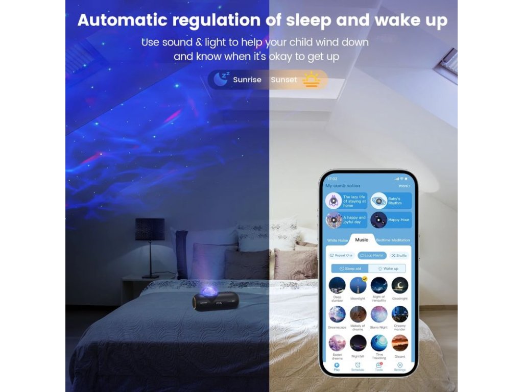 Pomocou mobilnej aplikácie si môžeš Glocusent nastaviť tak, aby každý večer automaticky spustil projekciu aj zvuky a postupne ich stlmil. Ráno ťa naopak môže privítať energizujúcou hudbou a príjemným svetlom. Funkcie „Čas ísť spať“ a „Čas vstávať“ ti pomôžu vytvoriť pravidelný spánkový režim, nechýba ani kalkulačka spánku pre svieže prebúdzanie.