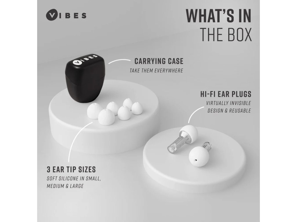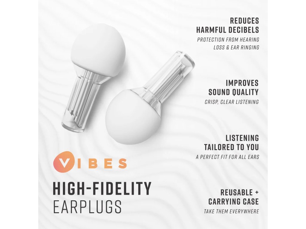Vibes sú znovu použiteľné štuple do uší stvorené pre kvalitu zvuku. Tradičné penové štuple do uší tlmia len vysoké frekvencie, nie nízke (bass) zvuky, čo spôsobuje to, že zvuk, ktorý počujete, je skreslený. V porovnaní s tým štuple Vibes znižujú hlasitosť všetkých frekvencií rovnako od bassu po vysoké frekvencie. Vďaka tomu počujete zvuky čistejšie, len pri tichšej hlasitosti. Štuple Vibes zlepšujú váš zážitok z hudobného vystúpenia.