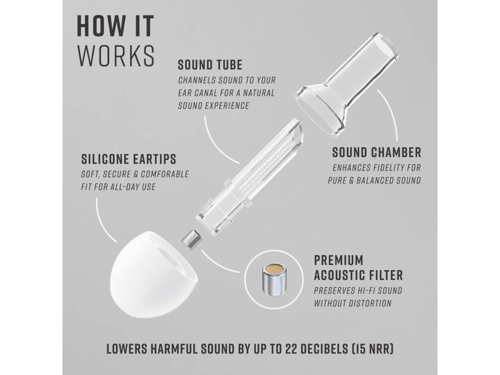 Na rozdiel od tradičných penových štupľov, ktoré zvuk blokujú a tlmia, štuple Vibes zvuk filtrujú. Vďaka špeciálne vyvinutej tubičke, ktorá vyvažuje zvukové vlny, a vďaka akustickým filtrom, ktoré znižujú hladinu decibelov, vám štuple Vibes umožnia chrániť vaše uši a zostať v hlasnom prostredí bez toho, aby vám to spôsobilo nepohodlie a poškodenie sluchu.