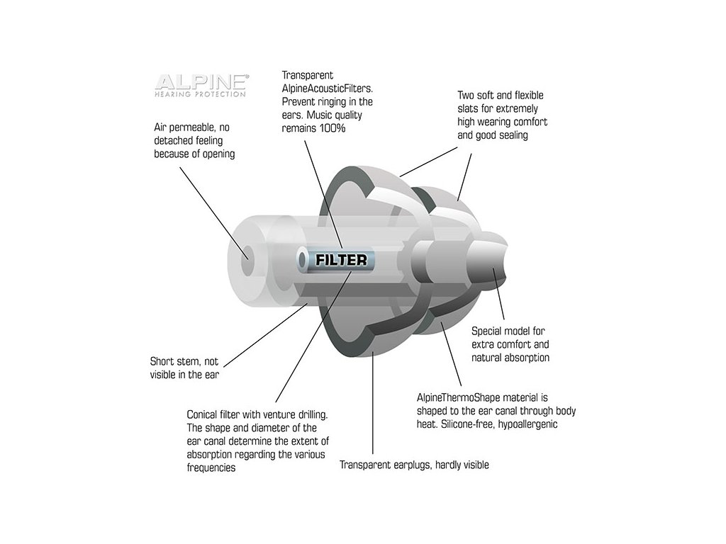 Na základe dvadsaťročných skúseností spoločnosť ALPINE vyvinula prevratný model štupľov s filtrom, ktorý tlmí všetky rušivé zvuky. Dobre premyslený tvar štupľov bol podrobený rozsiahlym testom. Štuple perfektne sedia v uchu, vďaka čomu prirodzene pohlcujú okolitý hluk.