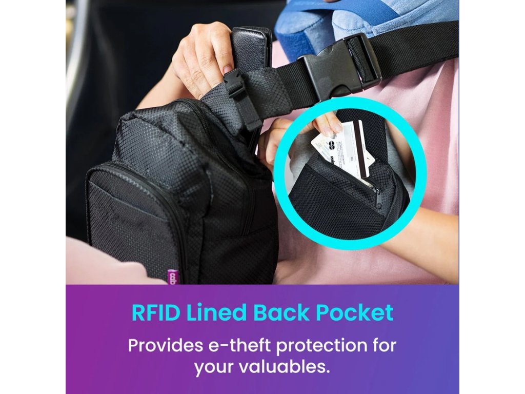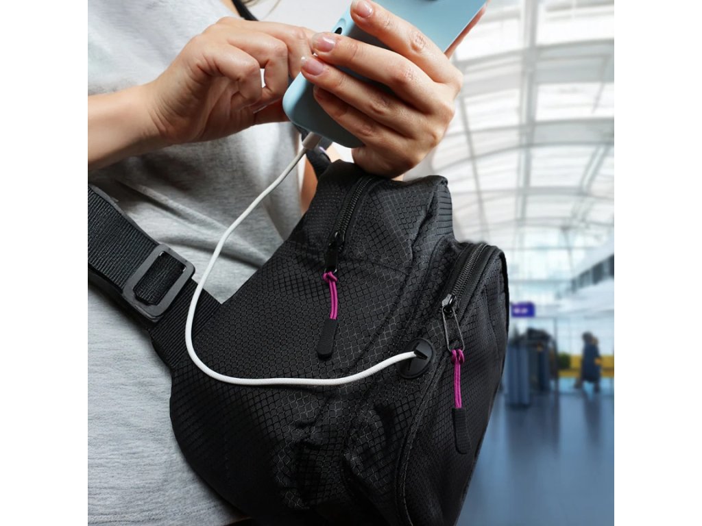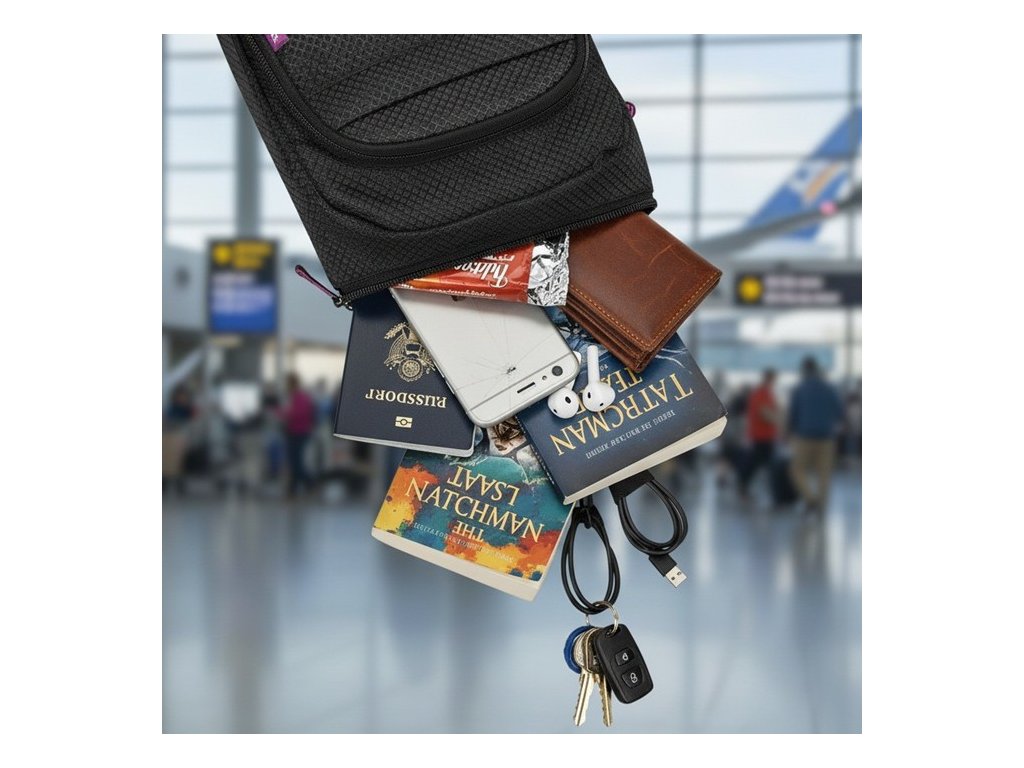 Vaše cennosti ochráni RFID vrecko proti elektronickým krádežiam, takže kreditné karty či doklady budú v bezpečí. Vďaka špeciálnemu otvoru na káble môžete pohodlne nabíjať telefón alebo počúvať hudbu, bez toho aby ste museli mať zariadenie v ruke. Praktický klip umožní pripevniť tašku na batožinu, stôl v lietadle či iný povrch – veci tak zostanú vždy čisté a bezpečné.