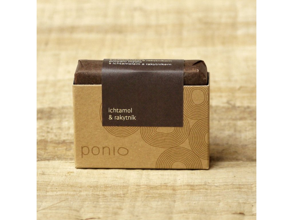 Ichtamolové mydlo Ponio obsahuje, ako už je z názvu zrejmé, ichtamol (ichtiol, ammonium bituminosulfonat) farmaceutickej kvality. Ten patrí medzi bitúmenové dechty a vďaka svojim antiseptickým, antimikrobiálnym a antimykotickým účinkom je často využívaný na liečbu kožných problémov. Druhú kľúčovú zložku mydla tvorí rakytníkový olej, získaný šetrnou a ekologickou extrakciou CO2 z organického rakytníka. Tento olej je špecifický svojím zložením, obsahuje veľké množstvo kyseliny palmitoolejovej, tiež nazývanej Omega-7. Kyselina palmitoolejová pokožku ošetruje, napomáha jej regenerácii, ochrane membrán a zabraňuje oxidácii (starnutiu pokožky).