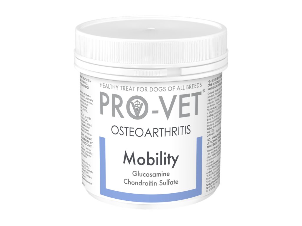 PRO-VET Mobility sú 100% prírodné srvátkové pastilky špeciálne vyvinuté pre psy trpiace zníženou pohyblivosťou, osteoartritídou alebo reumatizmom. Obsahujú extrakt zo slávky zelenej (Perna canaliculus), ktorá je bohatá na glykozaminoglykány prirodzene sa vyskytujúce v kĺbovej chrupavke, a prášok zo žraločích chrupaviek, známy svojimi protizápalovými účinkami. Tieto zložky spoločne napomáhajú regenerácii opotrebovaných alebo zranených kĺbov, zmierňujú bolesť a zlepšujú celkovú pohyblivosť vášho miláčika.