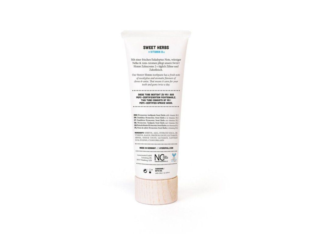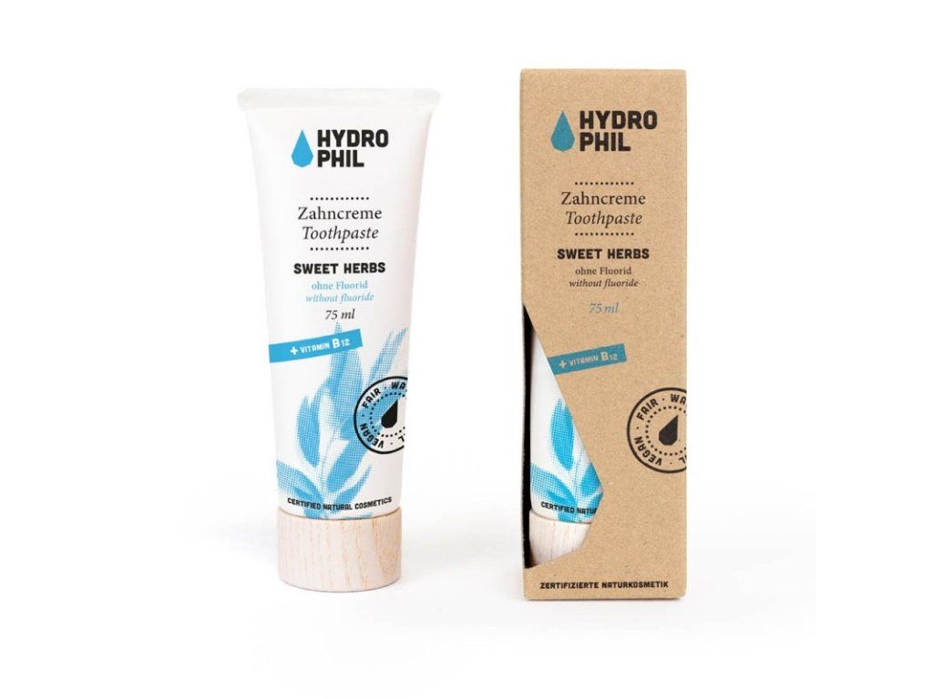 Zubná pasta bez fluóru s certifikátom prírodnej kozmetiky NCS udrží svieži dych vďaka eukalyptu, klinčekom a anízu. Kompozícia aktívnych ingrediencií posilní zubnú sklovinu, ochráni ďasná a celkové zdravie ústnej dutiny. Pasta je obohatená o vitamín B12 a nenájdete v nej žiadne mikro plasty, parabény, silikóny či syntetické vône. Stočená je v tube vyrobenej z 95 % z lokálneho smrekového dreva. Hydrophil navyše podporuje ekologické projekty v Indii, a zubná pasta je preto CO2 neutrálna. Každej ekologickej kefke tak bude robiť náramne príjemnú spoločnosť.